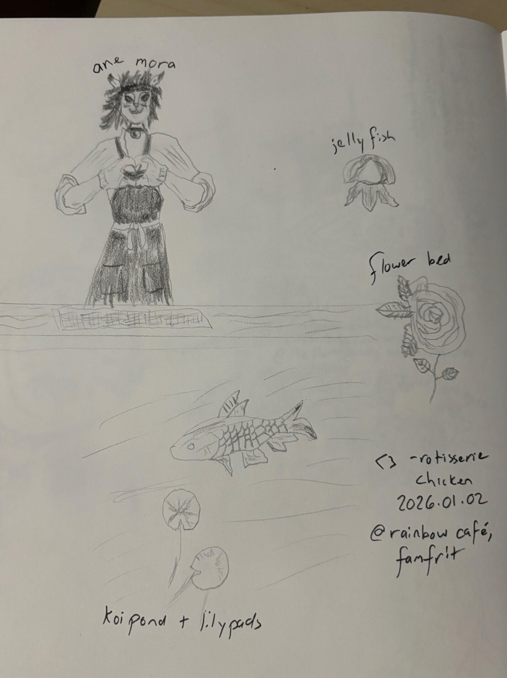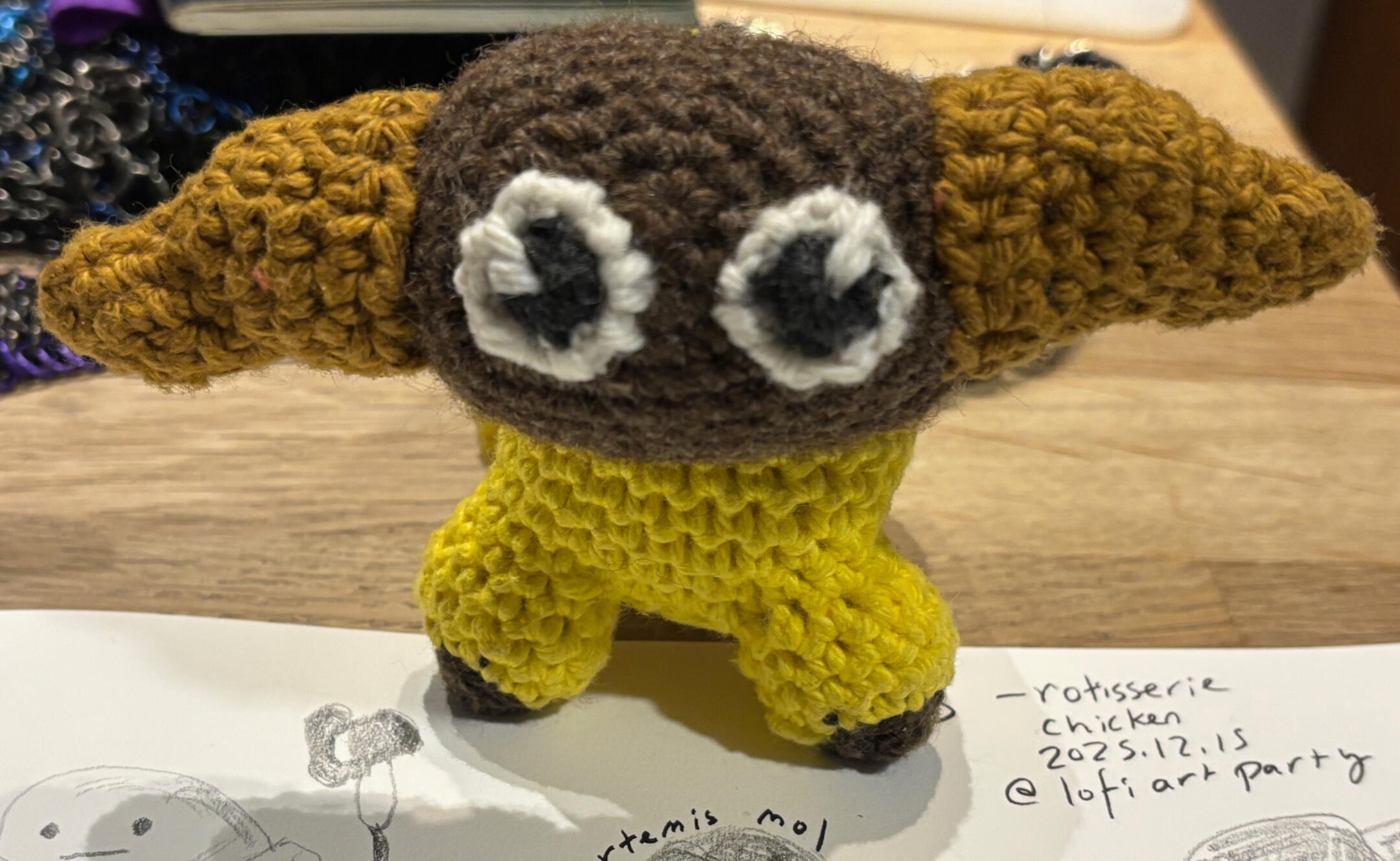 I've been learning to draw, both with pencil and paper as well as digital arts. I'm a regular attendee at art parties such as Lofi and the Rainbow Cafe. If you like what you see and would be interested in your own Rotisserie Chicken Original, reach out! I keep a Bluesky with my work.